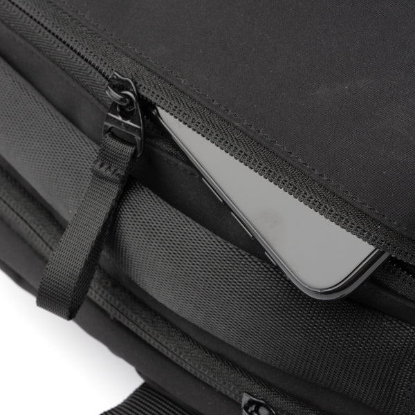 Rucsac din poliester 150D. În interior, are un compartiment principal cu un buzunar dublu cu un separator căptușit conceput pentru transportul laptopurilor de până la 17", precum și un buzunar mai mic cu fermoar. Include un buzunar exterior cu fermoar ascuns pentru transportul obiectelor mai mici. Pe laterale are două buzunare invizibile, unul dintre ele cu închidere cu fermoar, ambele adânci. Include curea troler. Are mânere și partea pentru umeri căptușite pentru un confort sporit. Este deosebit de rezistent datorită materialului său și reprezintă o opțiune versatilă datorită dispunerii și caracteristicilor buzunarelor sale.