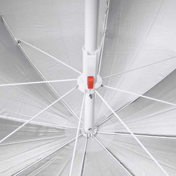 Umbrelă de plajă din 8 panouri din nailon rezistent și cu protecție UV. Disponibilă într-o gamă largă de culori. Tijă tip tub cu înălțime reglabilă și spițe pe alb. Marginea de la cupolă cu bordură lată cu cusătură dublă. Include husă de transport cu curea de umăr.